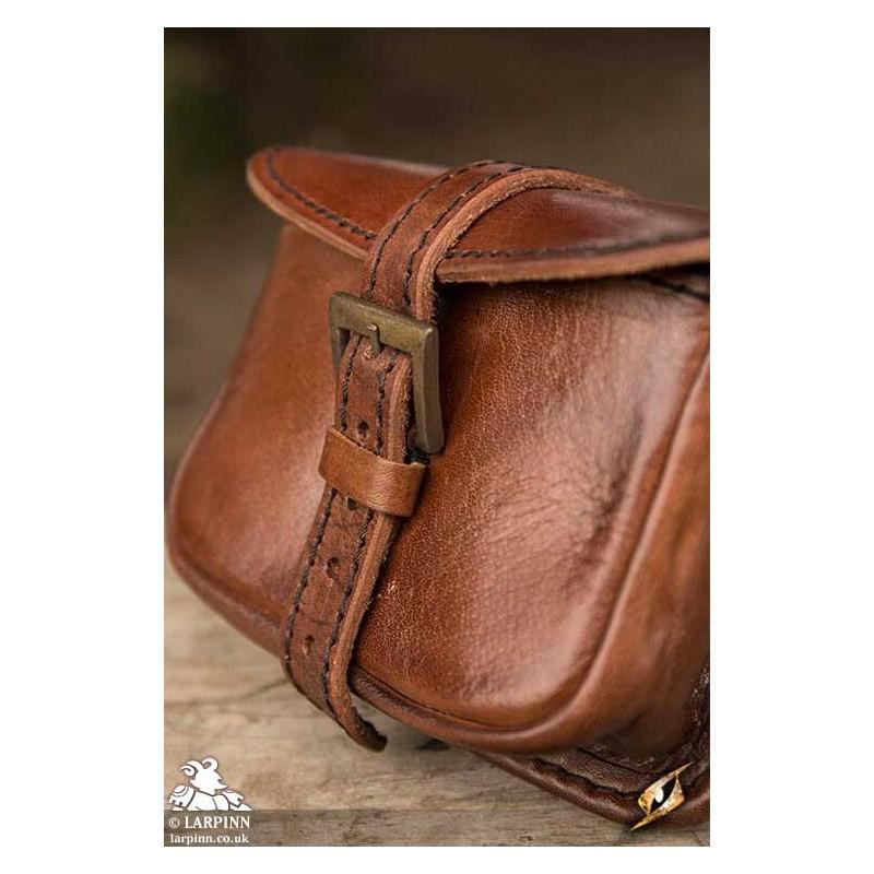 The Warrior Bag is a large leather box-bag intended to hang from a belt. The bag can be closed with two sturdy leather straps secured by brass buckles. The bag is fitted with long leather straps under the lid to keep its content securely inside during combat.