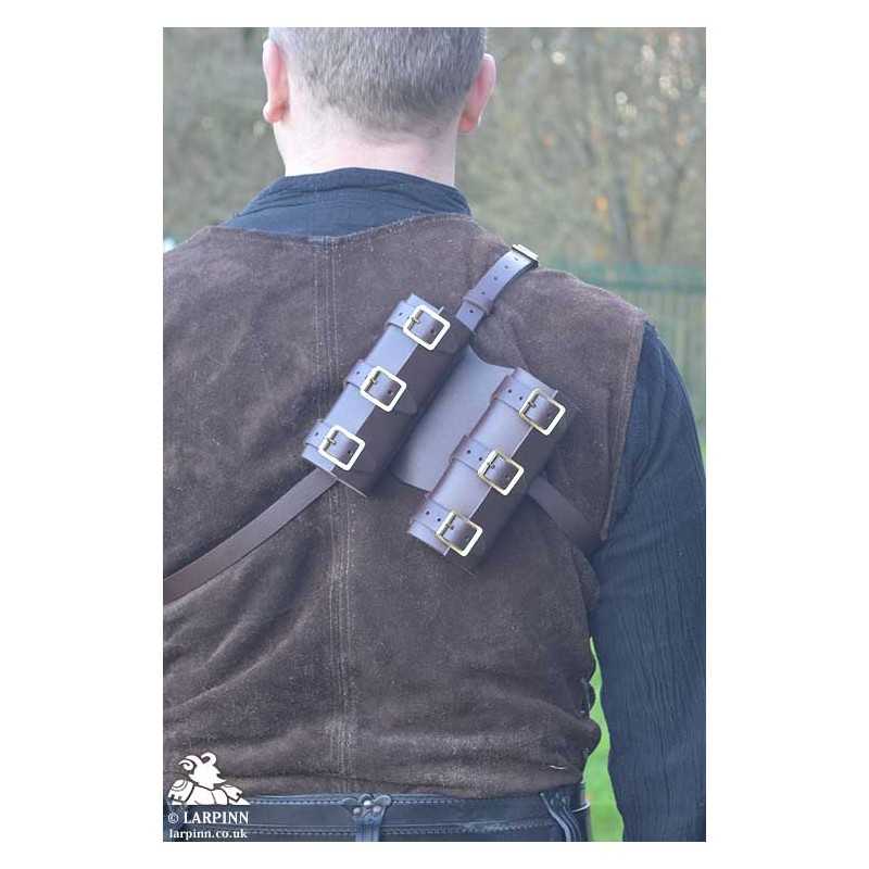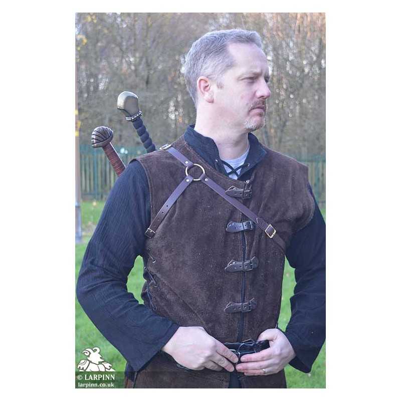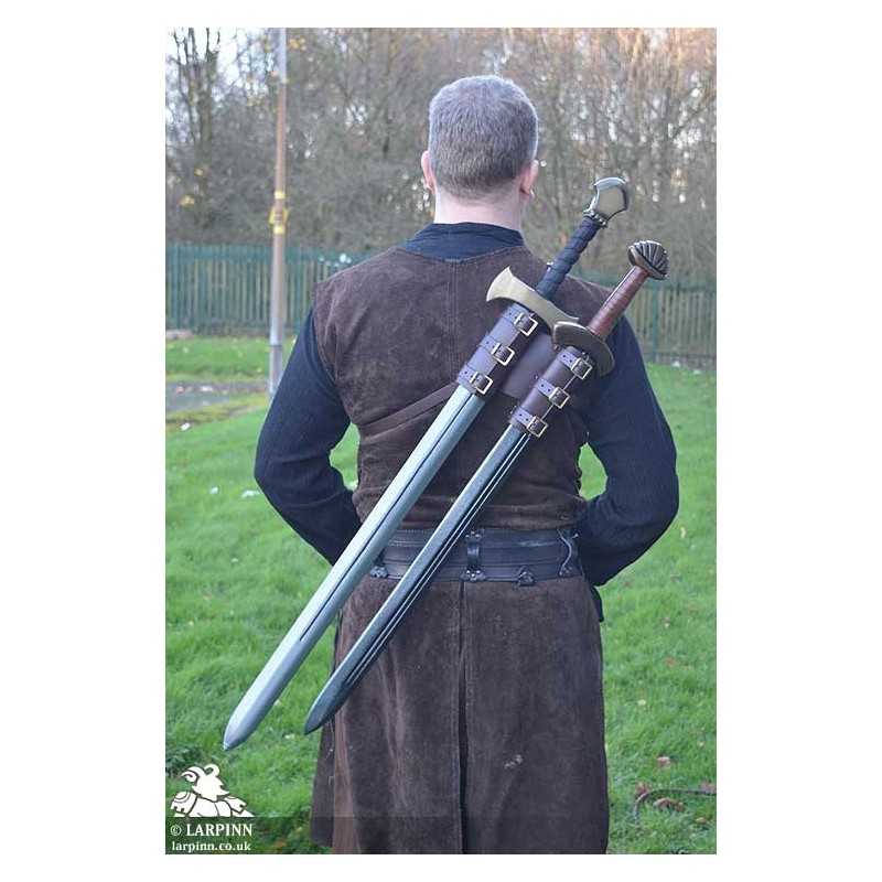 The harness is held securely in place with three adjustable straps which allows you to create the perfect fit. The sword frogs at back are also adjustable allowing you to adjust for blade width for different sword circumferences, or even combine with a full-length scabbard (which is not included).