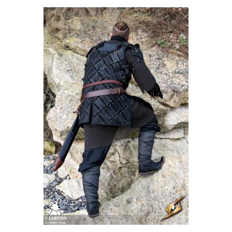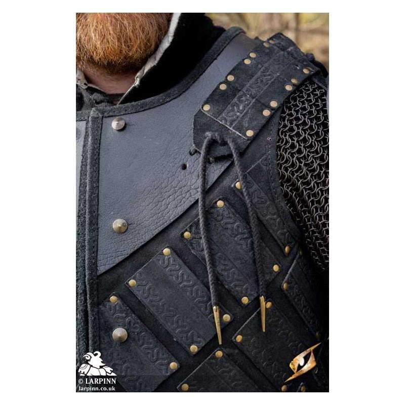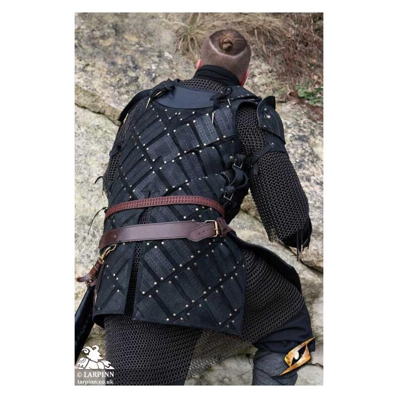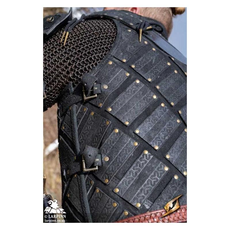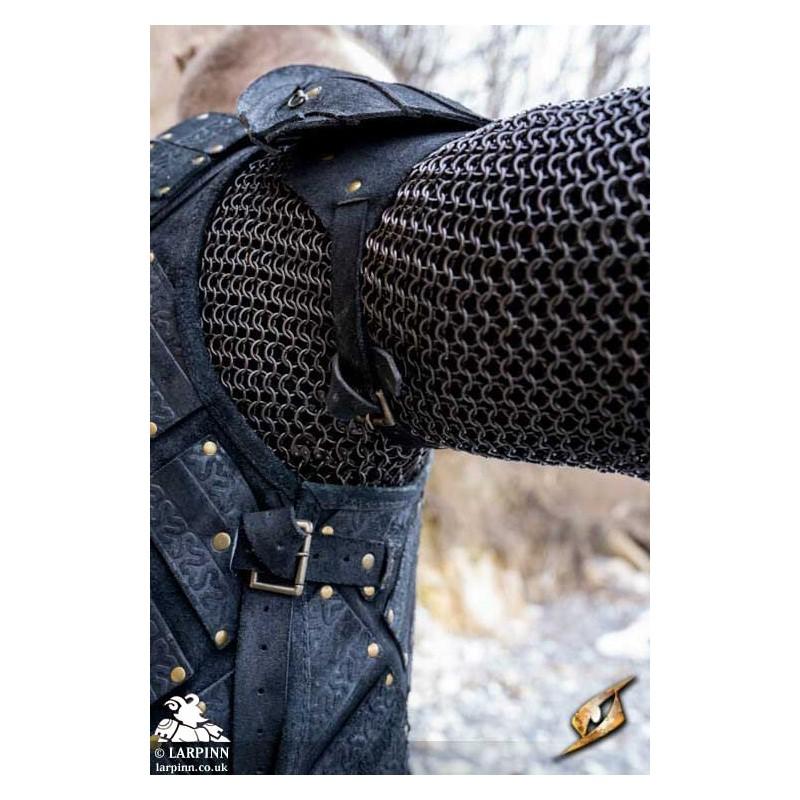 Epic Armoury's Black Suede Leather Woodsman Armor is more than just amazing. It is the perfect armour to wear if you play a ranger, rogue or various other characters. This fantasy Larp armour is made from a series of riveted leather plates that are embossed with a Celtic pattern and placed in a diagonal formation. This lightweight brigandine armour is embellished by stitched leather borders around its edges, adding strength to the armour and comfort for the warrior. A series of leather straps in the rear allow the fighter to adapt the armour for an adjusted fit according to the costume worn. For convenience, the warrior can easily dress in the armour using a series of metal studs that help close the armour from the front. Regardless of your role, your Larp character will benefit from the defence this coat of plates provides.