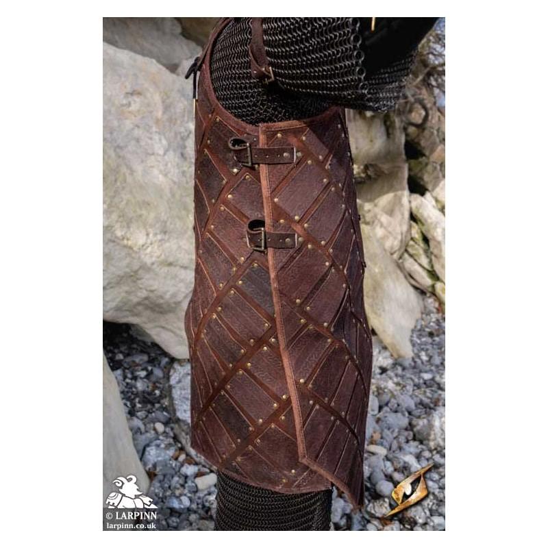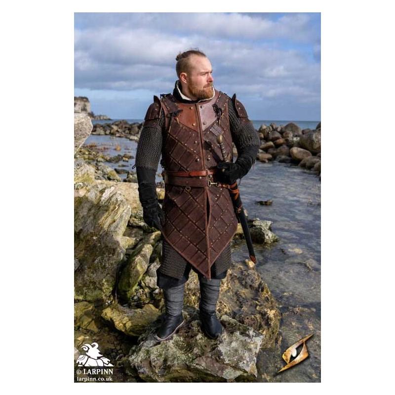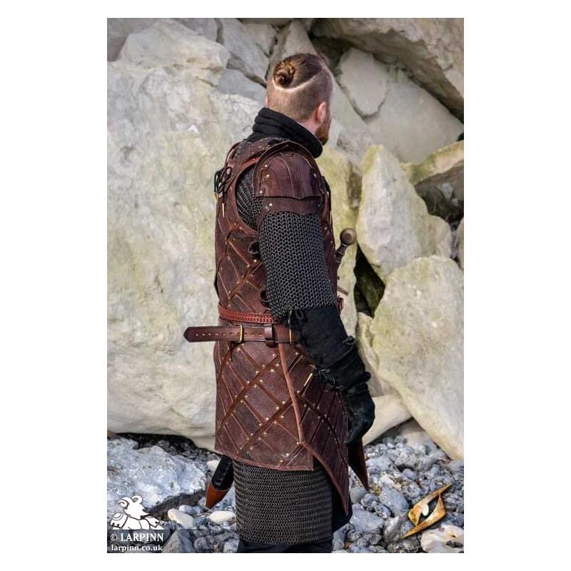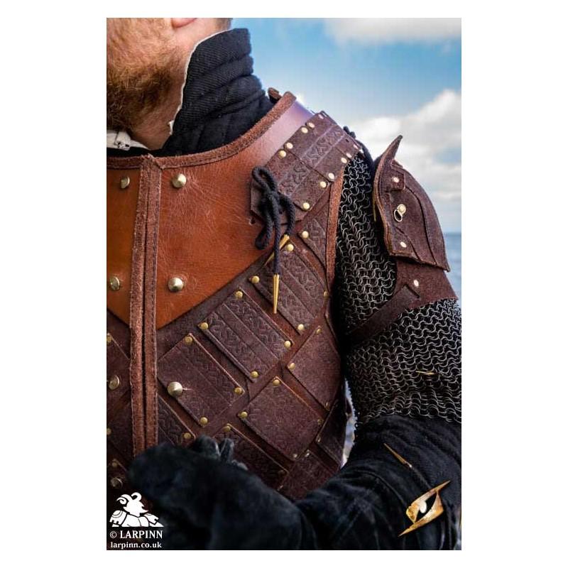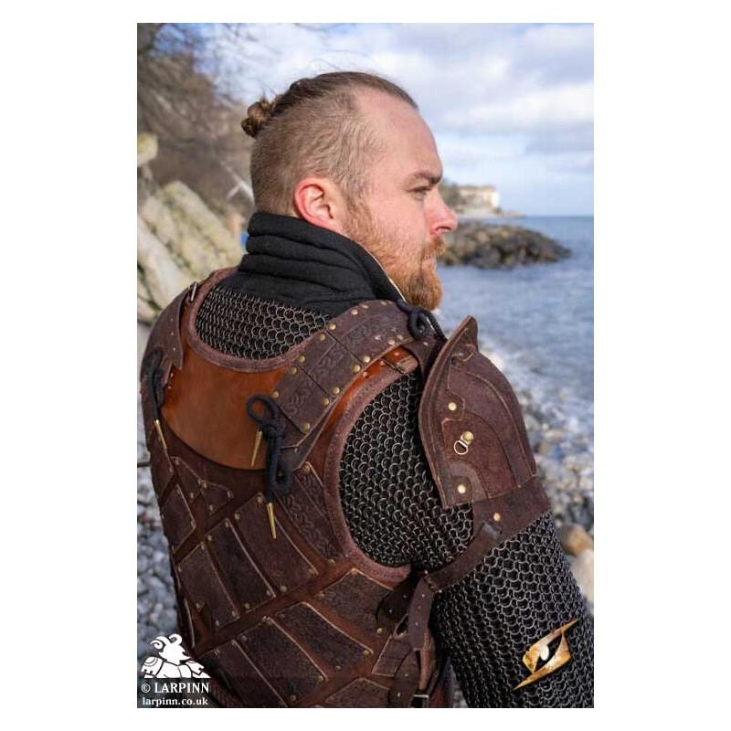 Epic Armoury's Brown Suede Leather Woodsman Armor is more than just amazing. It is the perfect armour to wear if you play a ranger, rogue or various other characters. This fantasy Larp armour is made from a series of riveted leather plates that are embossed with a Celtic pattern and placed in a diagonal formation. This lightweight brigandine armour is embellished by stitched leather borders around its edges, adding strength to the armour and comfort for the warrior. A series of leather straps in the rear allow the fighter to adapt the armour for an adjusted fit according to the costume worn. For convenience, the warrior can easily dress in the armour using a series of metal studs that help close the armour from the front. Regardless of your role, your Larp character will benefit from the defence this coat of plates provides.