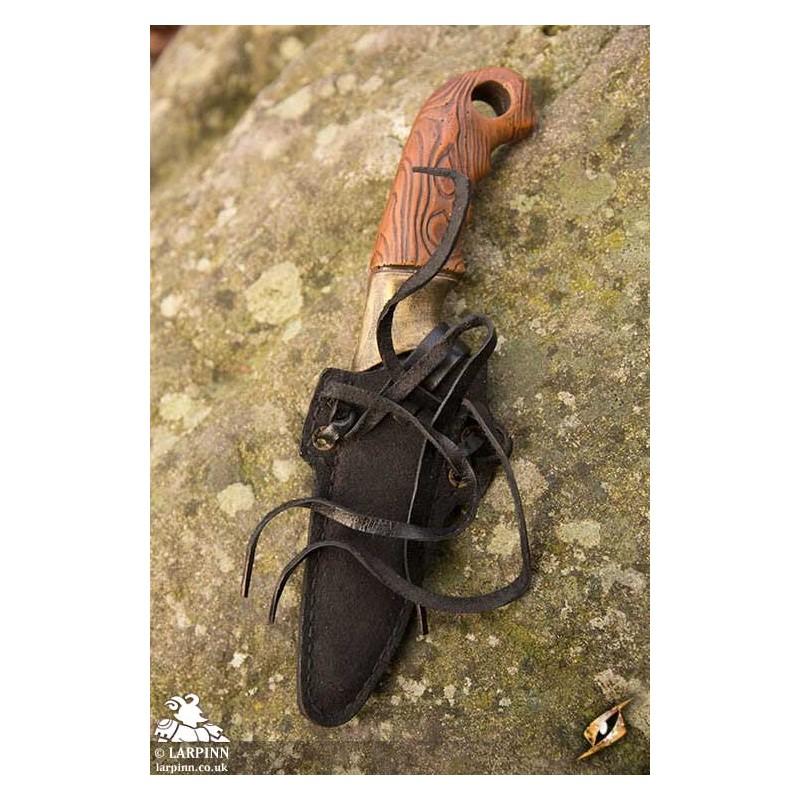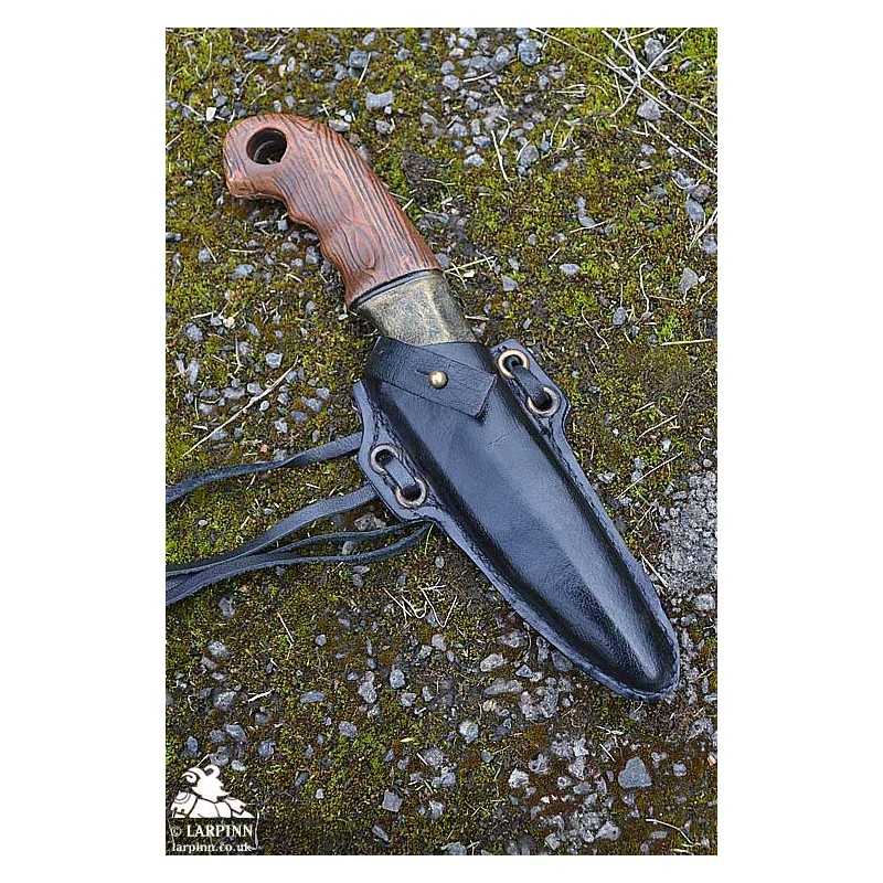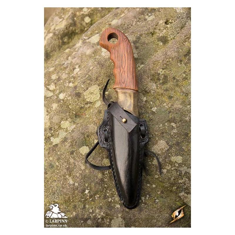 Epic Armoury’s Woodsman Knife Holder comes with a knife, and isspecifically designed to hold the Epic Armoury Woodsman Knife throwing weapon. The handmade holder attaches to the belt or armour using two leather ties. A leather strap buttons over the knife, keeping it secure even in rough fights.