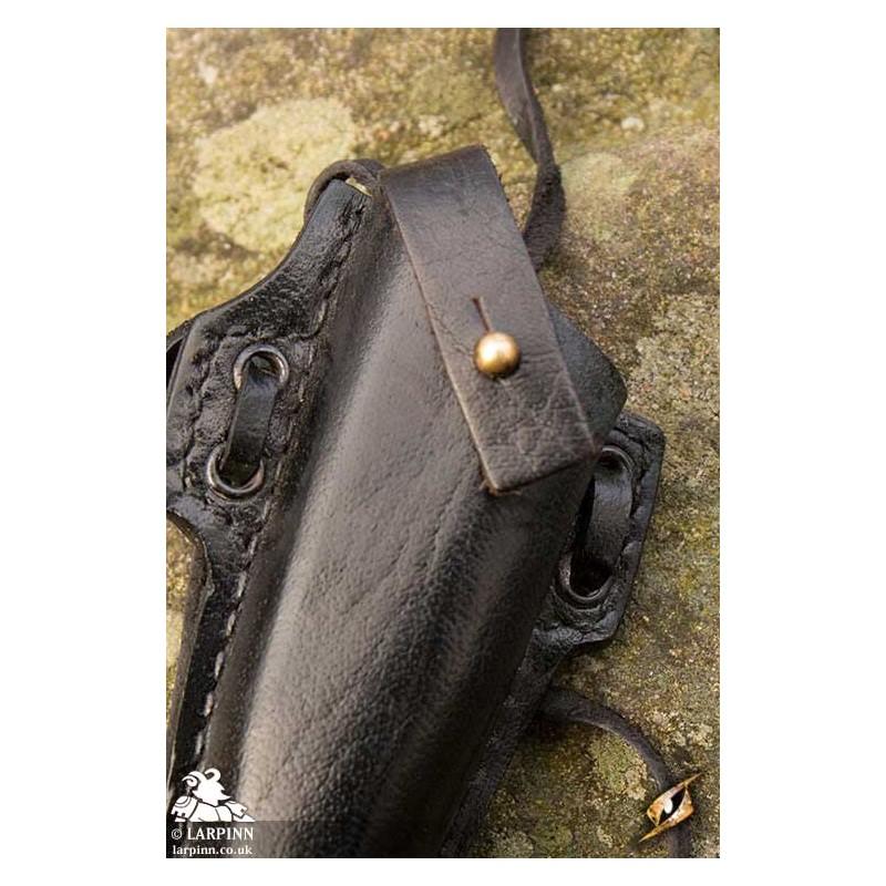 Made from brown full-grain leather and reinforced stitching around the edges, this weapon holder is built to keep its shape and withstand the abuse of a LARP with regular leather care.