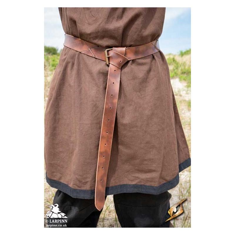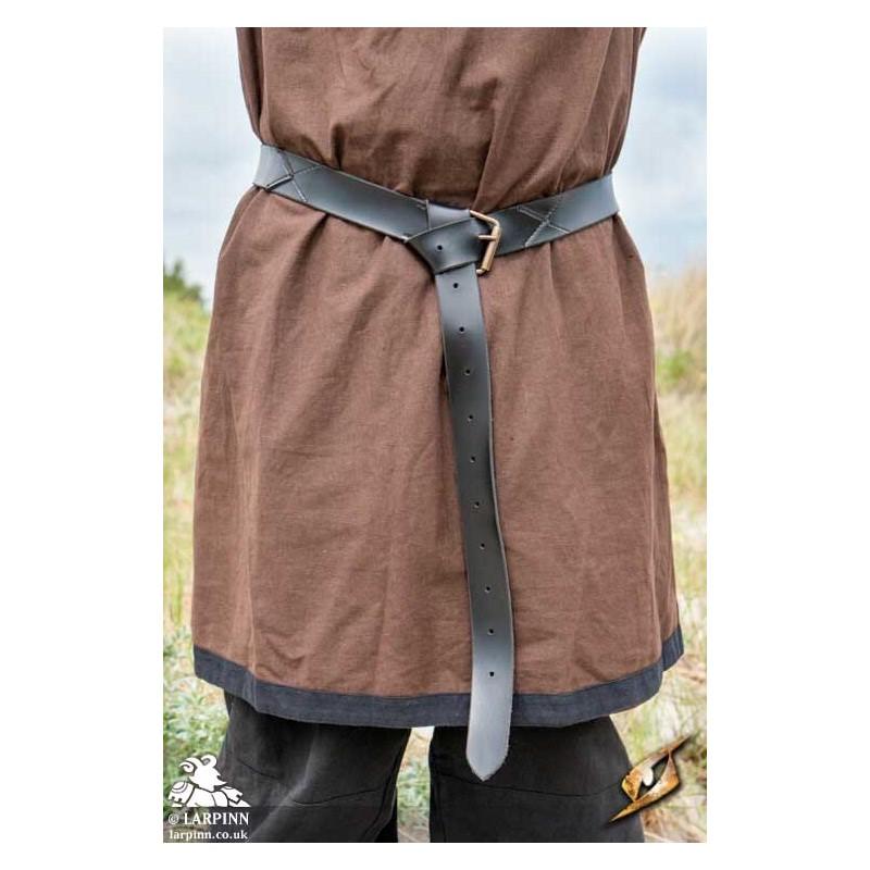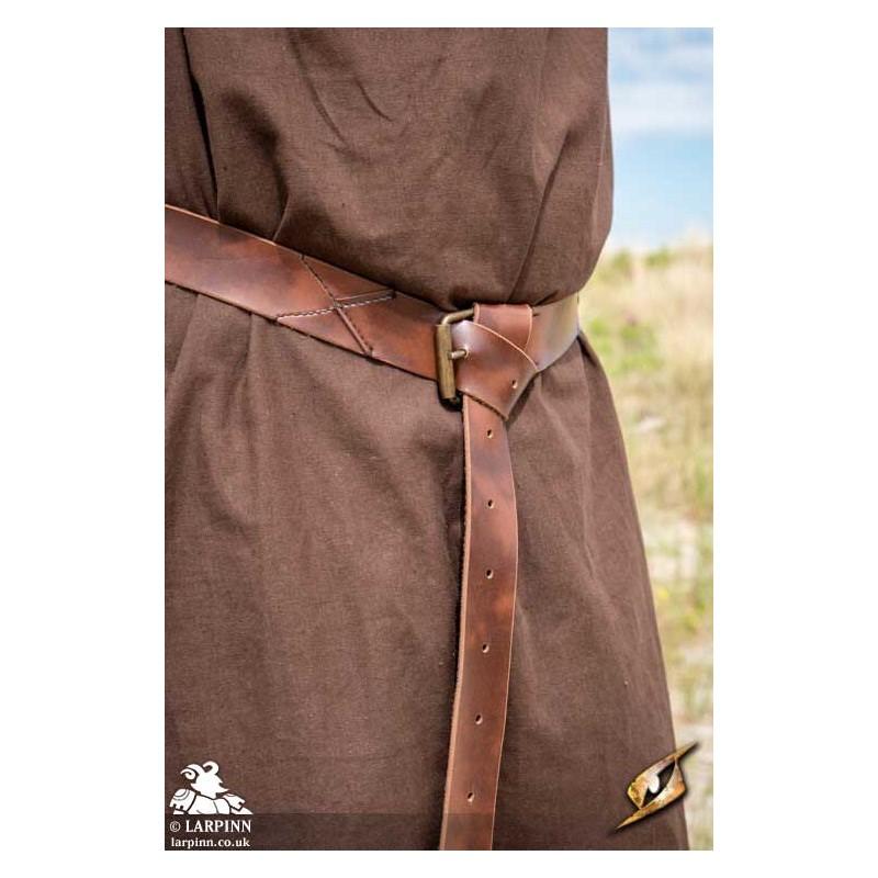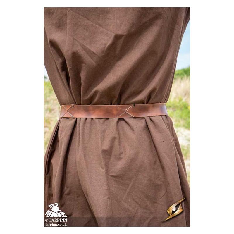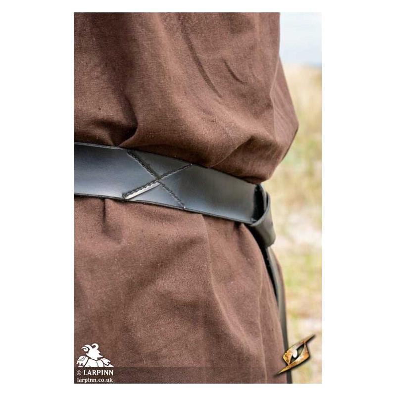 The X Belt - Faux Leather is a long belt made from animal-friendly materials. This belt is stylish with its stitched X-shaped accents, designed to fit into the medieval-fantasy aesthetic blend. With a 70 cm belt-tongue and 16 holes, adjust this belt to a large range of sizes to fit your unique body. Secure the belt using its rounded, steel belt buckle.