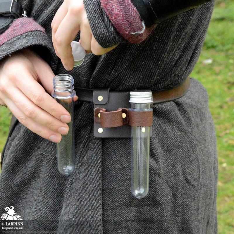 The Yanif Potion Vile Holder is a handy belt harness to easily carry around plastic test tubes. This is a fantastic option for healers, alchemists and magic users within LARP, cosplay and theatre.
