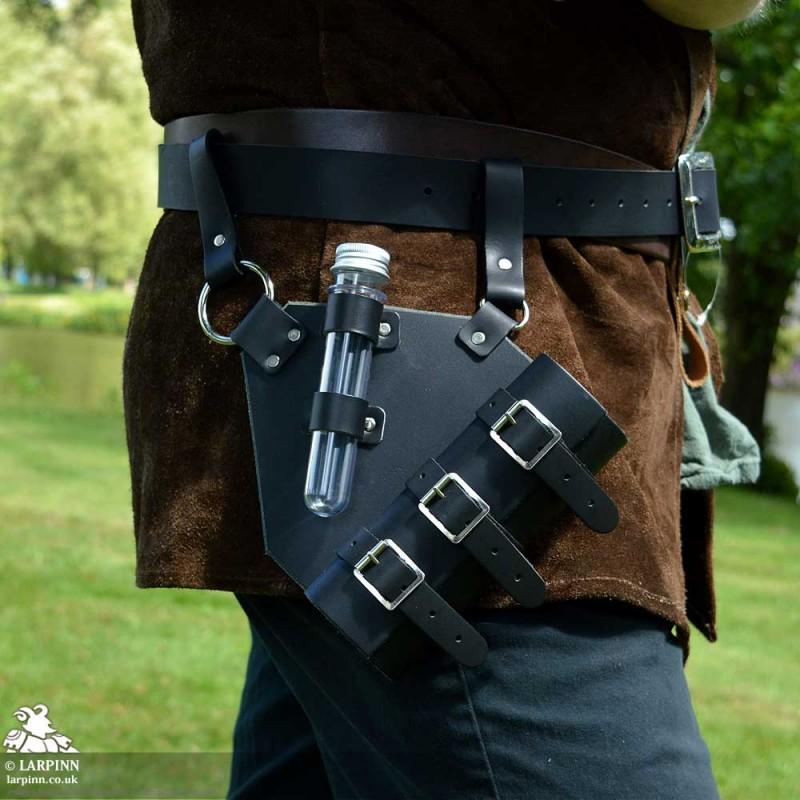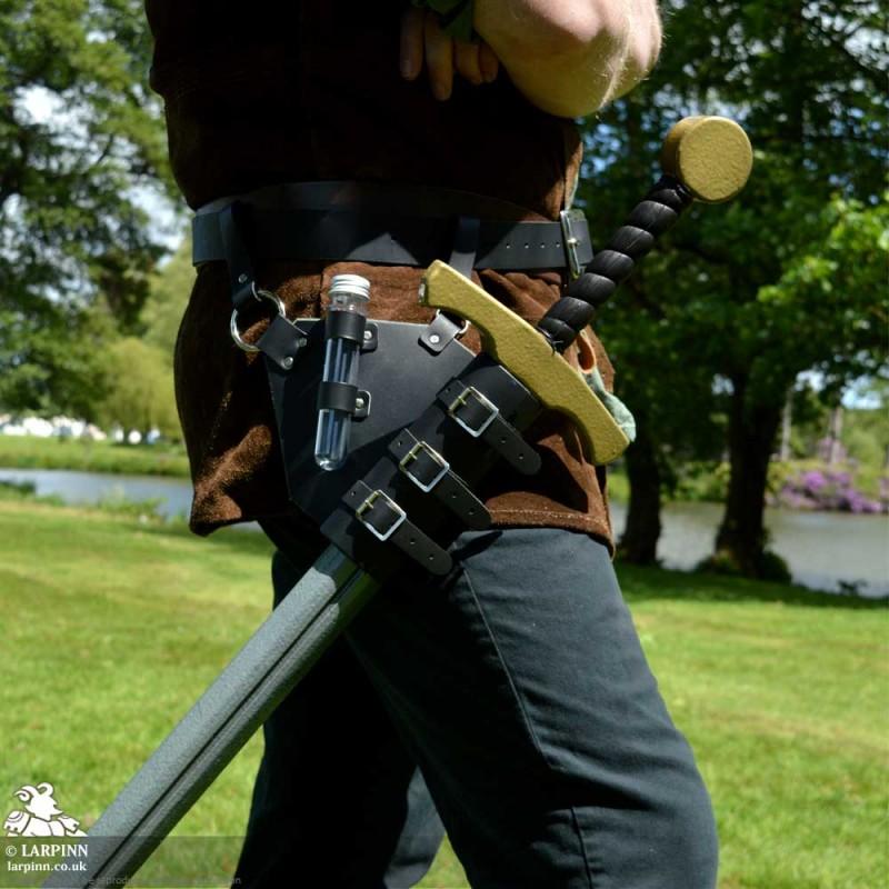 The Yanif Scabbard is a sword holster that also has a handy potion vile loop to keep your poultices on hand at all times. The scabbard is mounted at an angle, making it a perfect fit for heavier swords which may tip or fall out of other sheaths. This holster also has adjustable straps to fit different blade widths as tightly or loosely as you would like.