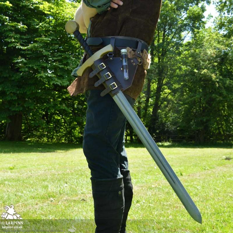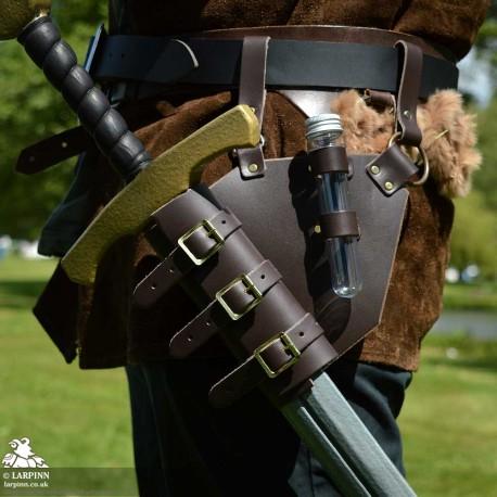 The Yanif Scabbard is a sword holster that also has a handy potion vile loop to keep your poultices on hand at all times. The scabbard is mounted at an angle, making it a perfect fit for heavier swords which may tip or fall out of other sheaths. This holster also has adjustable straps to fit different blade widths as tightly or loosely as you would like.